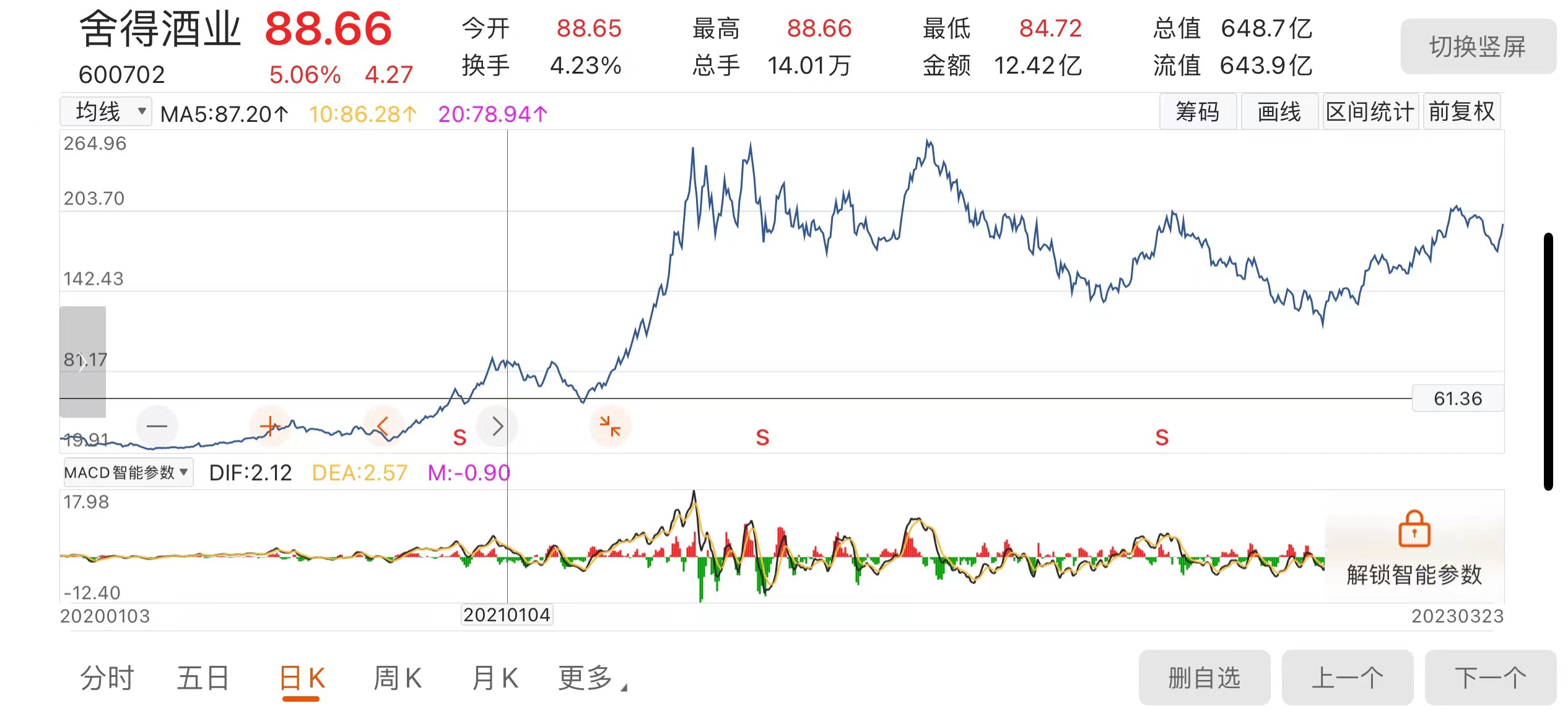 将时间倒回到复星系入主两家酒厂前。2020年12月31日,复星系成功四川沱牌集团有限公司70%股权。收购后第一个交易日(2021年1月4日)舍得酒业以88.66元/股收盘,涨幅达5.06%。