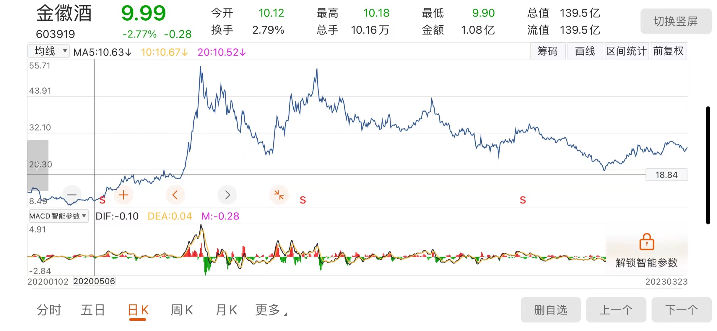 3月23日,舍得酒业以195.06元/股收盘,金徽酒以27.49元/股收盘。