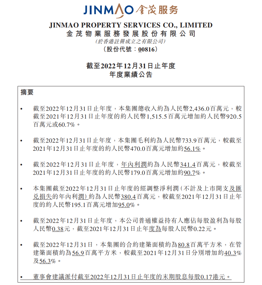 3月24日,金茂服务(HK:00816)发布2022年度业绩报告。报告期内,金茂服务累计实现营业收入24.36亿元,同比增长60.7%;净利润 3.41亿元,同比增长90.7%。