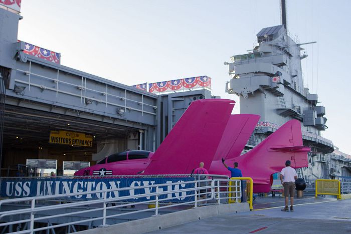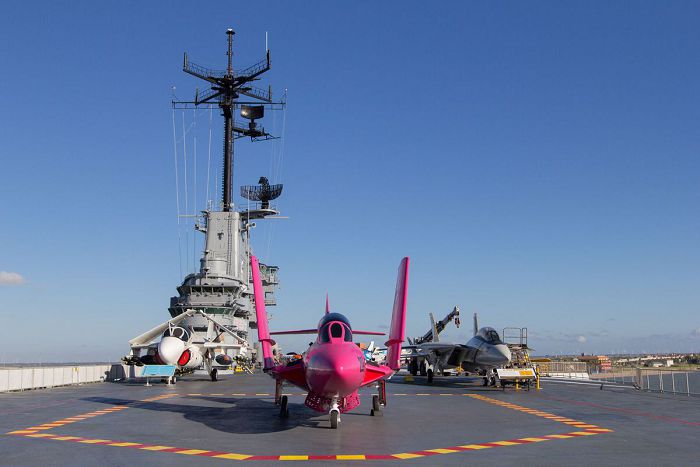 停靠于德克萨斯州科珀斯克里斯蒂湾的列克星敦航空母舰博物馆在本周一公布了这架F9F-8“美洲狮”战机,博物馆官方新闻声明显示,这架飞机身披“充满活力的粉色外壳”,它现在正在列克星敦航母的甲板上进行展出,此次展出会一直持续到月底。