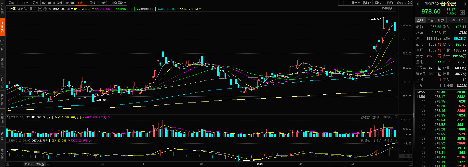 多家金企实现业绩增长的同时,A股贵金属板块的走势也十分活跃。2022年年内,东方财富贵金属板块指数从679.24开始震荡走高,截至年底报778.36,涨幅约15%。