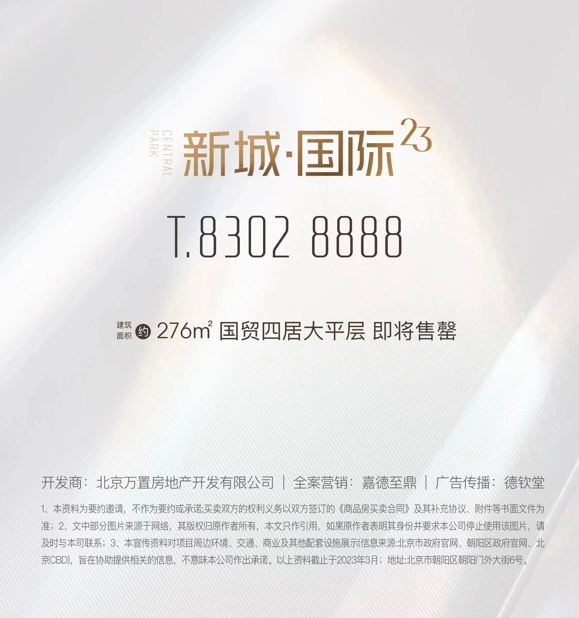 同时,房地产行业的分化也将继续加剧,城市间的分化,产品间的分化,这也意味着,资产配置需要更加谨慎。长期看来,未来占据了核心城市核心资源的优质产品将站在时代周期的风口下成为高净值人群的优选配置。在这样的背景下,新城国际²³再次屹立时代的潮头,成为具备竞争壁垒、能抵御风险的核心资产。