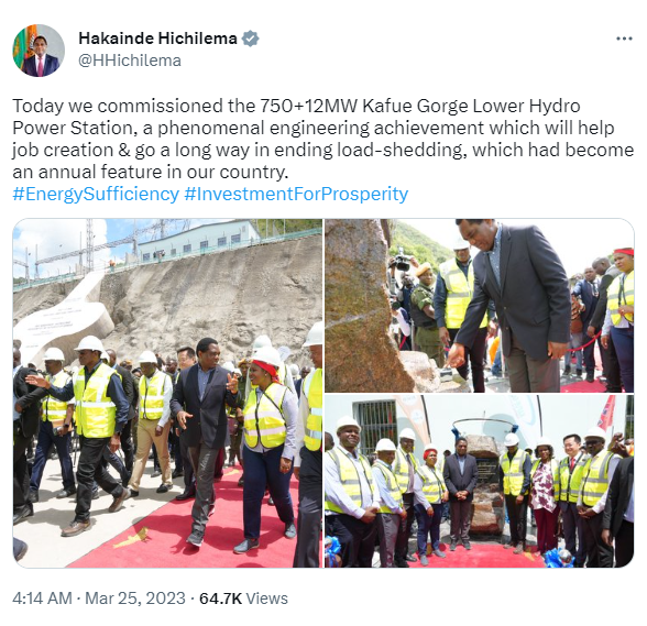 据中国驻赞比亚大使馆,3月24日,杜晓晖大使陪同希奇莱马总统出席由中国金融机构融资、中国企业承建的下凯富峡水电站项目第五台机组点火暨项目竣工仪式。