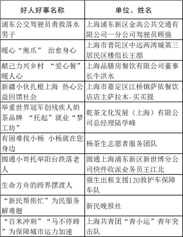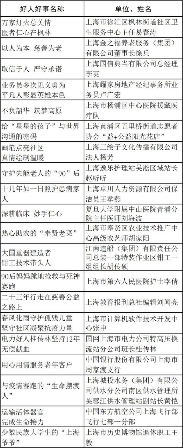 附:2022年度上海市社会主义精神文明好人好事表扬名单