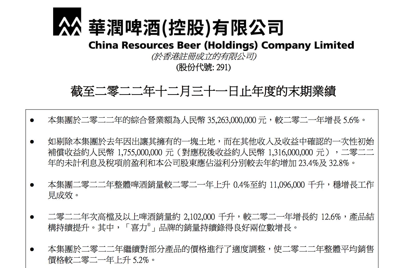 2023年3月24日,华润啤酒(控股)有限公司(以下简称“华润啤酒”)发布2022年全年业绩。财报显示,华润啤酒于2022年的综合营业额为人民币352.63亿元,较2021年增长5.6%;净利润为43.44亿元,同比下降5.3%;剔除一次性初始补偿收益影响,同比增长32.8%。