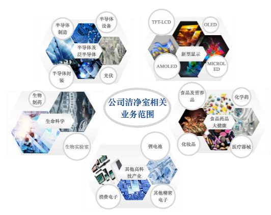 柏诚股份主要专注于为高科技产业的建厂、技改等项目提供专业的洁净室系统集成整体解决方案,覆盖半导体及泛半导体、新型显示、生命科学、食品药品大健康等国家重点产业,是国内少数具备承接多行业主流项目的洁净室系统集成解决方案提供商之一。
