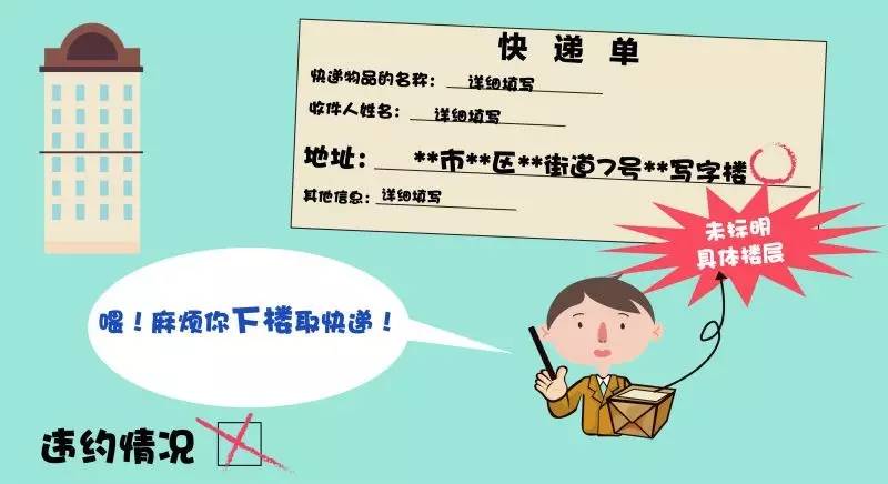 具体点儿说,就是寄件人在快递单上填写了的收件人姓名、地址等信息,可以视为双方约定的合同条款(这就意味着快递公司要按照约定履行合同),快递公司应该根据快递单上的信息(特别是地址信息)将物品送达收件人。且我国《快递市场管理办法》也明确规定:“企业应当将快件(邮件)投递到约定的收件地址(大家一定要记得填写具体楼层哦,尤其是那些高层的同学)和收件人或者收件人指定的代收人。”