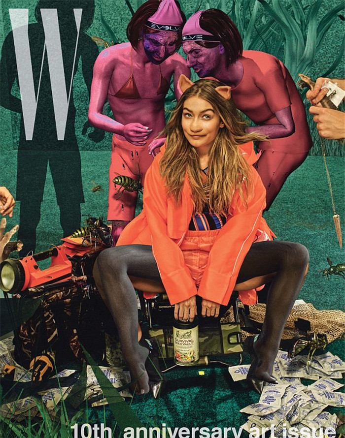 此次肯达尔·詹娜和吉吉·哈迪德的合作是为给杂志《W》的10周年特刊拍摄封面。照片中的两人站在露营帐篷外,穿着完全一样的裙子和鞋子。