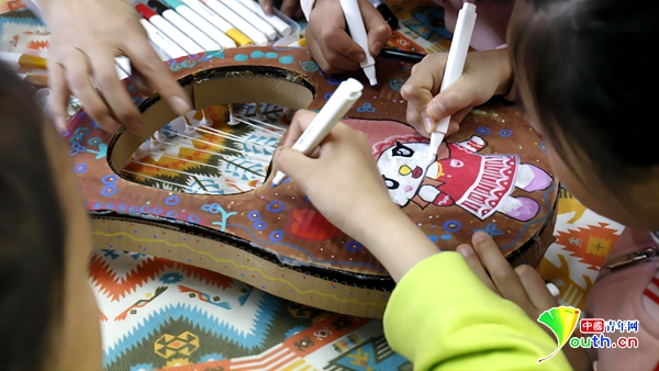小朋友在宝贝部落绘制月牙琴。中国青年网记者 王金海 摄