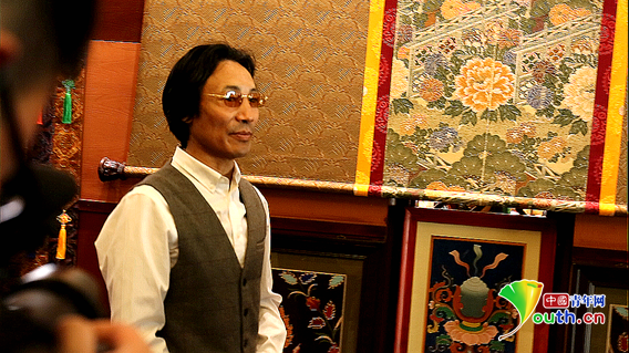 拉孟向记者讲解唐卡艺术。中国青年网记者 王金海 摄