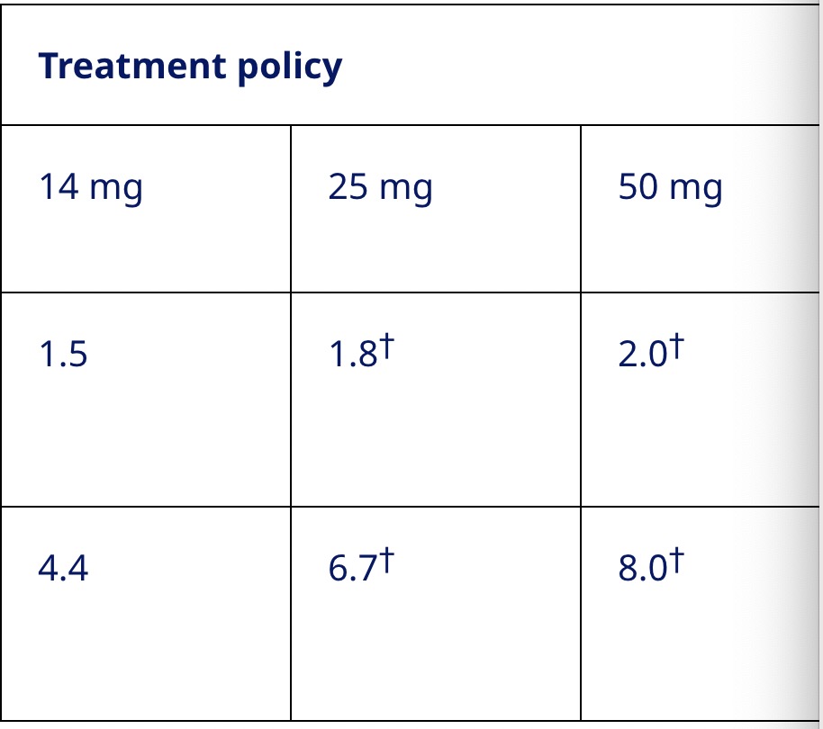 从治疗策略角度评估,患者平均基线HbA1c为9.0%,14mg、25mg和50mg剂量组患者HbA1c分别降低了1.5%、1.8%和2.0%;患者平均基线体重为96.4kg,14mg、25mg和50mg剂量组患者体重分别降低了4.4kg、6.7kg和8.0kg。