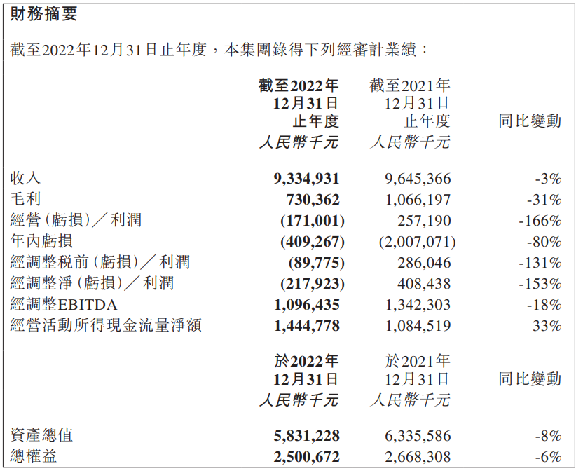 3月28日,安能物流(09956.HK)(下称安能)发布2022年年度业绩报告。2022年安能总收入达93.3亿元,同比减少3%;经调整净亏损2.18亿元,同比变动-153%;货运总量达1250万吨,基本维持2021年水平。