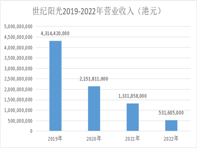 3月27日,港股世纪阳光发布2022年年报。年报显示,公司在2022年整体收入5.32亿港元(约4.67亿人民币),同比减少60.1%,2019年以来营业收入显著降低;税后亏损10.55亿港元(约9.25亿人民币),亏损同比减少15.8%,自2019年税后盈利4.28亿港元(约3.75亿人民币)以来,已经连续三年处于亏损状态。