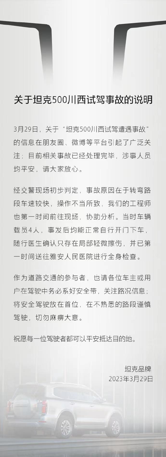 随后,坦克发布官方声明称,出事活动为坦克500川西试驾活动,经交警现场初步判定,事故原因在于转弯路段车速较快,操作不当所致。事发时车内载员4人,事发后均能正常自行开门下车,随行医生确认只存在局部轻微擦伤,并第一时间送医检查。坦克也已在第一时间派出工程师前往现场,协助分析此次事故。