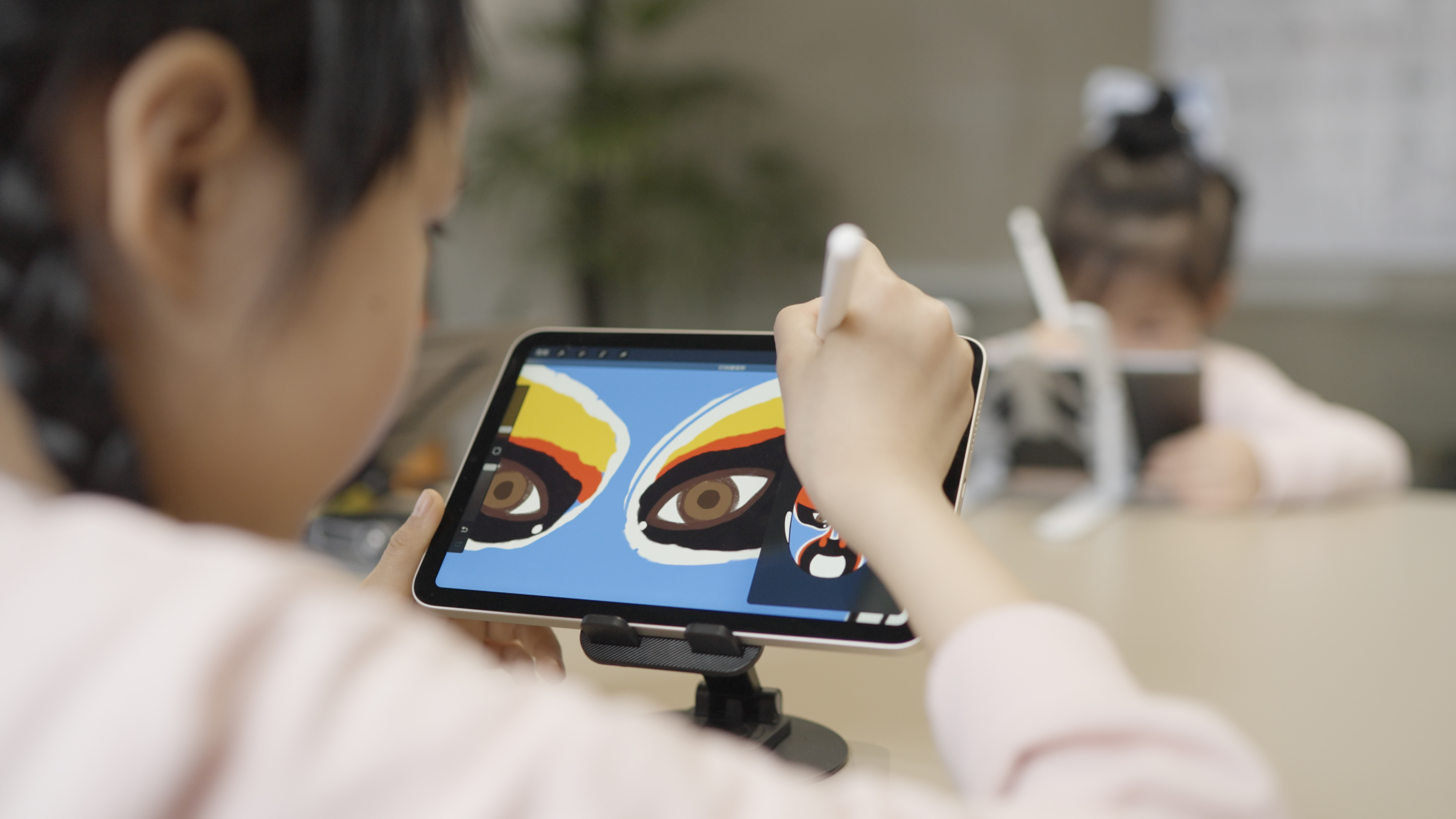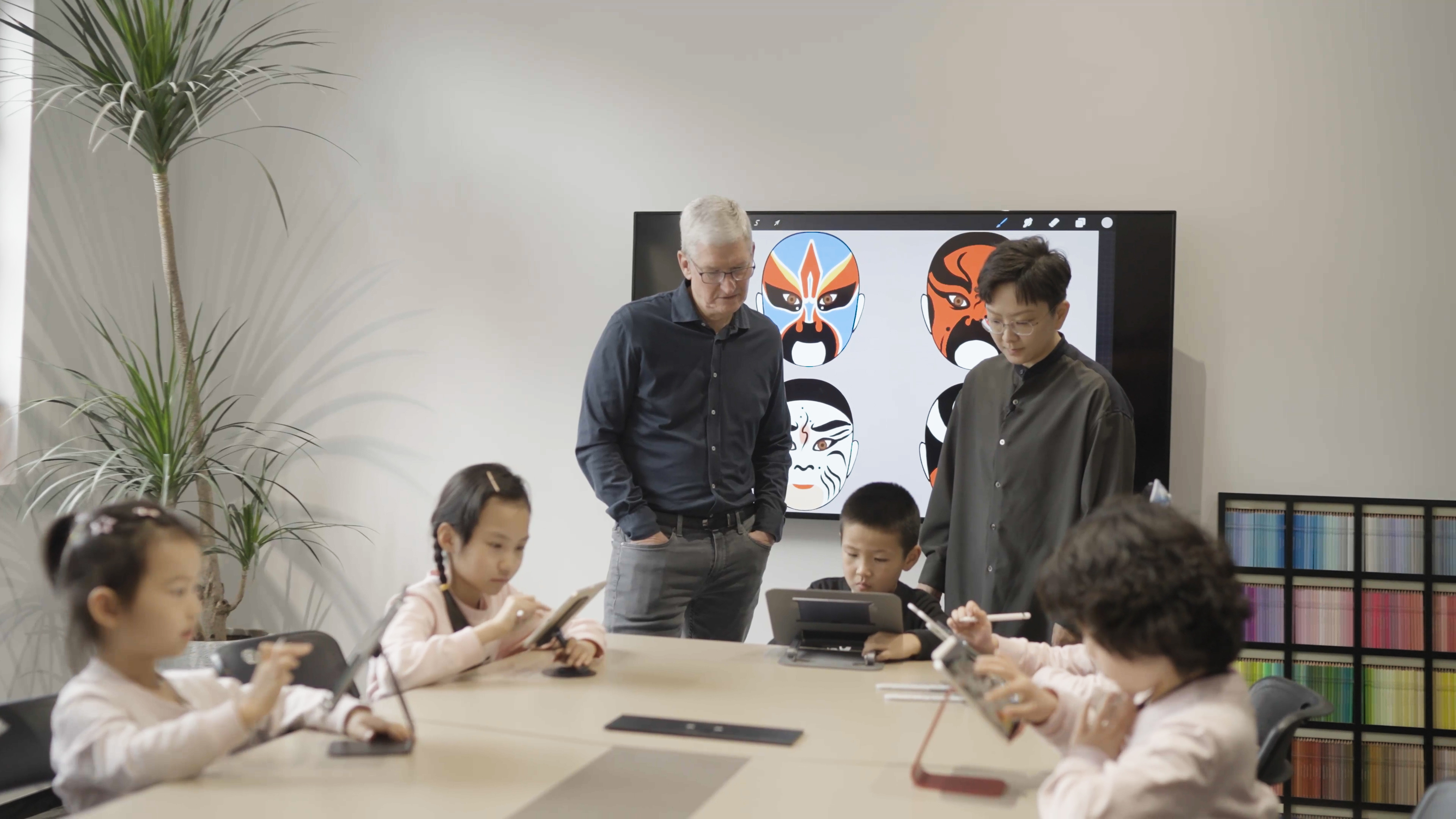 其二就是另一间教室内,一群五岁的小朋友们正在使用iPad+Apple Pencil绘制京剧脸谱,这是瑜音社融合课程的一部分。此过程中,库克比较好奇不同颜色的脸谱有怎样的寓意,并且对画作的细节进行了查看。身为校长的王珮瑜表示,以iPad作为教学工具,首先是其上手门槛低、适合类似年龄不大的孩子快速上手,而iPad的准确性也相当重要。