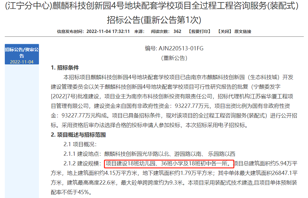 值得一提的是,现在麒麟中央公园附近的4号地还规划有配套中小学和幼儿园用地,去年11月份曾发布过相关招标公告,预计工期1000天,大约是2年9个月。