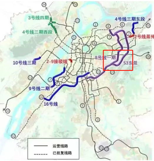 S3号线东延:线路起于南京南站,至仙林站,线路全长36.3公里,均为地下线,设站14座。