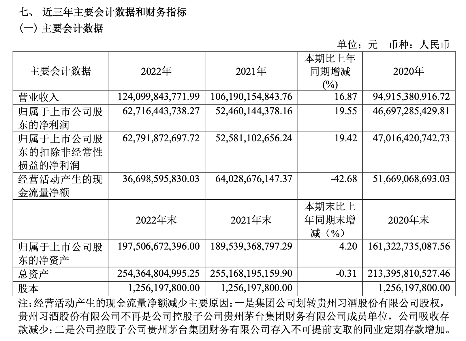 3月30日晚间,贵州茅台酒股份有限公司(以下简称“贵州茅台”)发布《2022年年度报告》显示,2022年全年实现营业收入1241亿元,同比增长16.87%;归属于上市公司股东的净利润627.16亿元,同比增长19.55%;经营活动产生的现金流量净额为366.99亿元,同比下降42.68%。