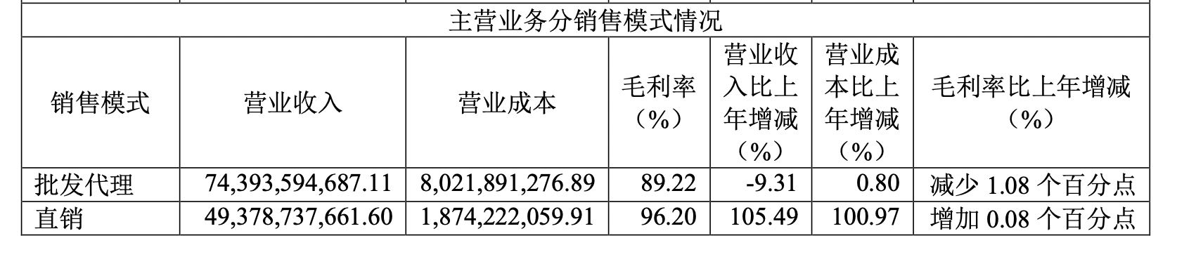 对比往年各渠道毛利率来看,从2018年至2021年直销渠道毛利率均高于批发渠道,但直至2022年打破了这样的数据“惯性”。根据公告显示,2018年至2022年,直销渠道毛利率分别为93.99%、95.01%、95.62%、96.12%以及89.22%,而批发渠道毛利率则为91.08%、91.03%、90.80%、90.30%以及96.20%,实现逆袭。