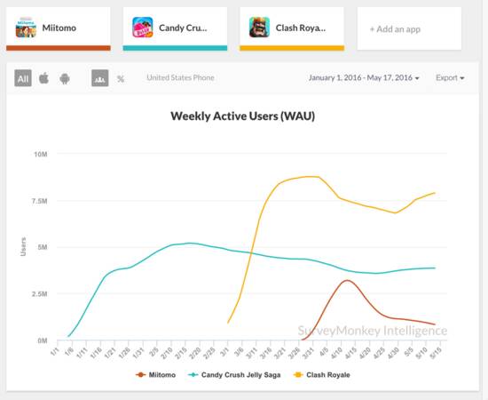 然而好景不长,《Miitomo》的周活跃用户在4月中旬达到峰值以后开始一落千丈。现在,我们在各路下载榜和收入榜上都没办法看到它的身影。