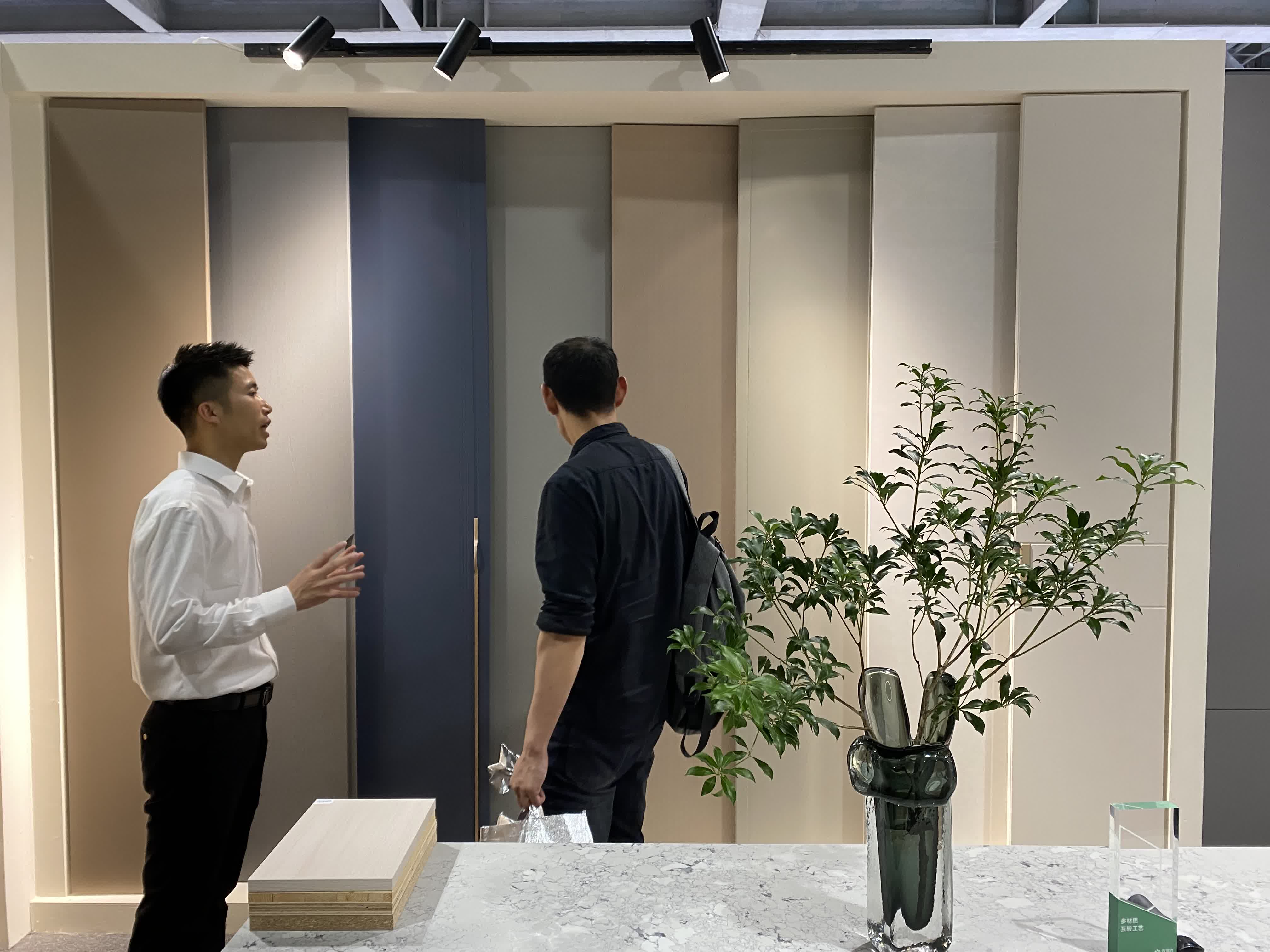 此次百得胜也在展位上展示了微店布局。一面墙放置水漆色板柜,一面墙放置8扇门板,另一面墙放置72色的色板。同时店里还会放置一个电子屏幕,作为品牌案例库的分享。