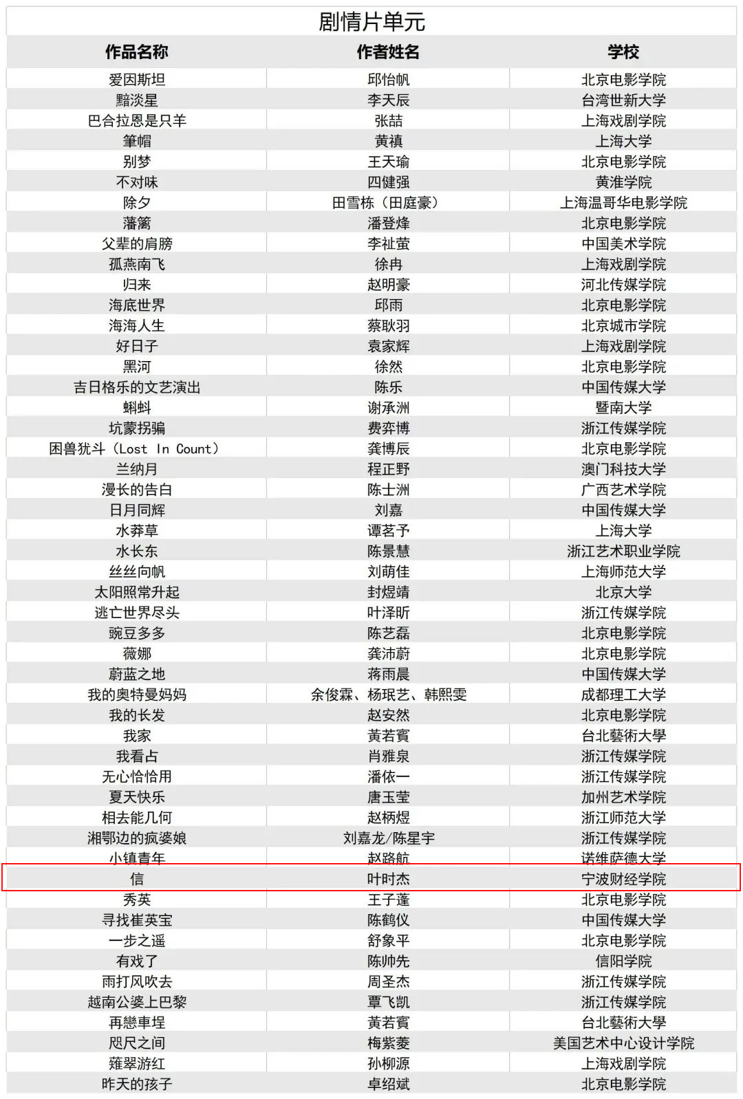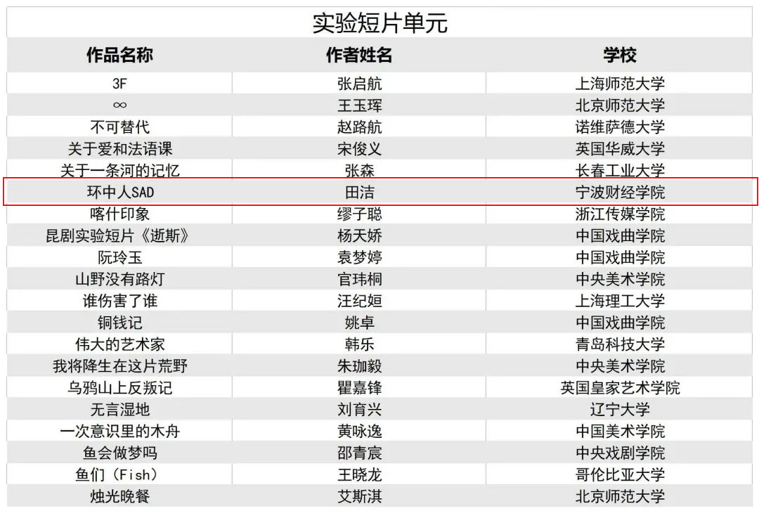 近日,第30届北京大学生电影节·第23届国际大学生原创影片推选公布了入选名单,宁波财经学院象山影视学院影视制作系2019级田洁等同学凭借实验短片《环中人SAD》成功入选实验短片单元,影视制作系2020级叶时杰等同学凭借短片《信》成功入选剧情片单元。该校也是宁波市唯一入选北京大学生电影节国际大学生原创影片推选的高校。