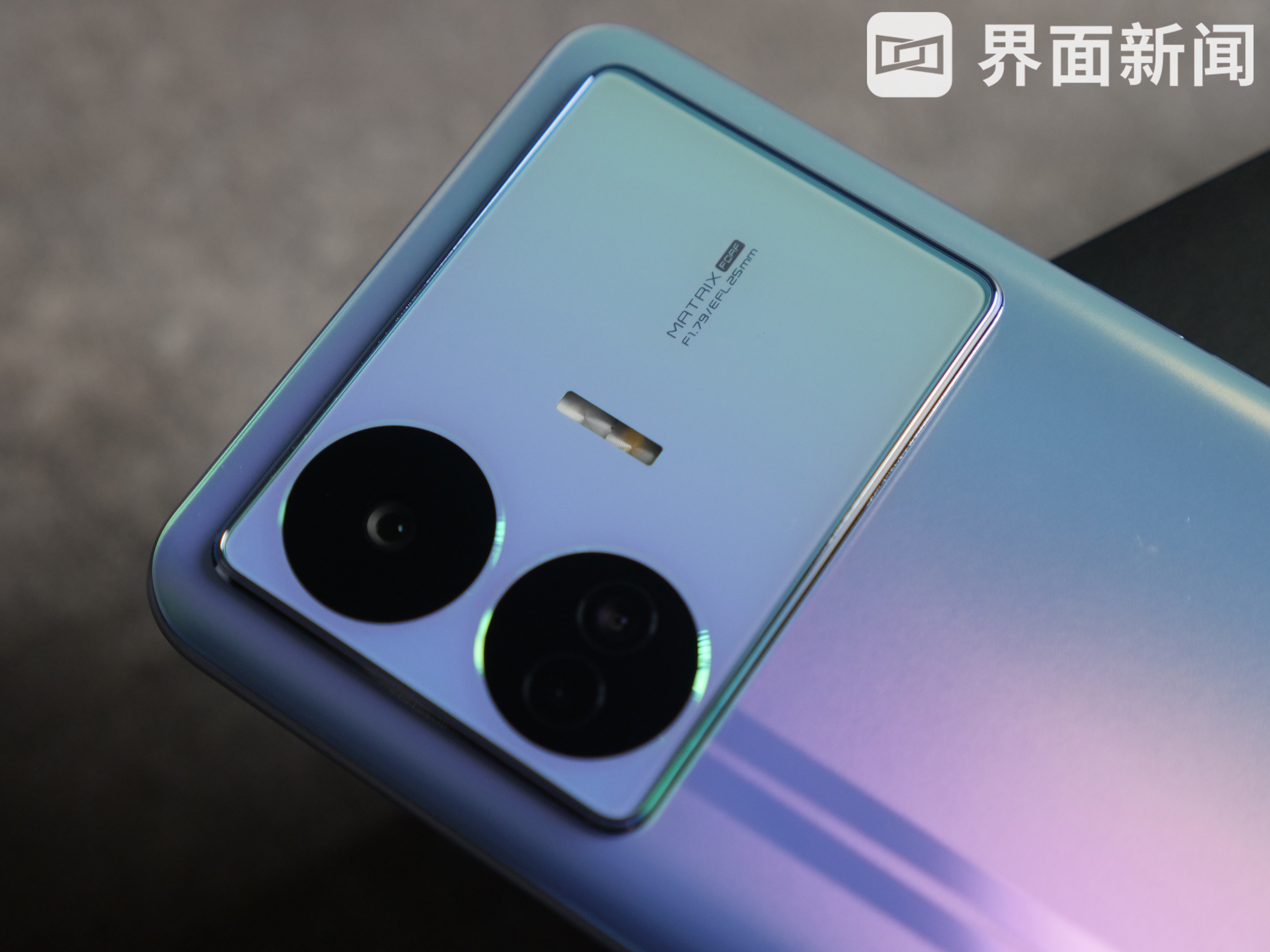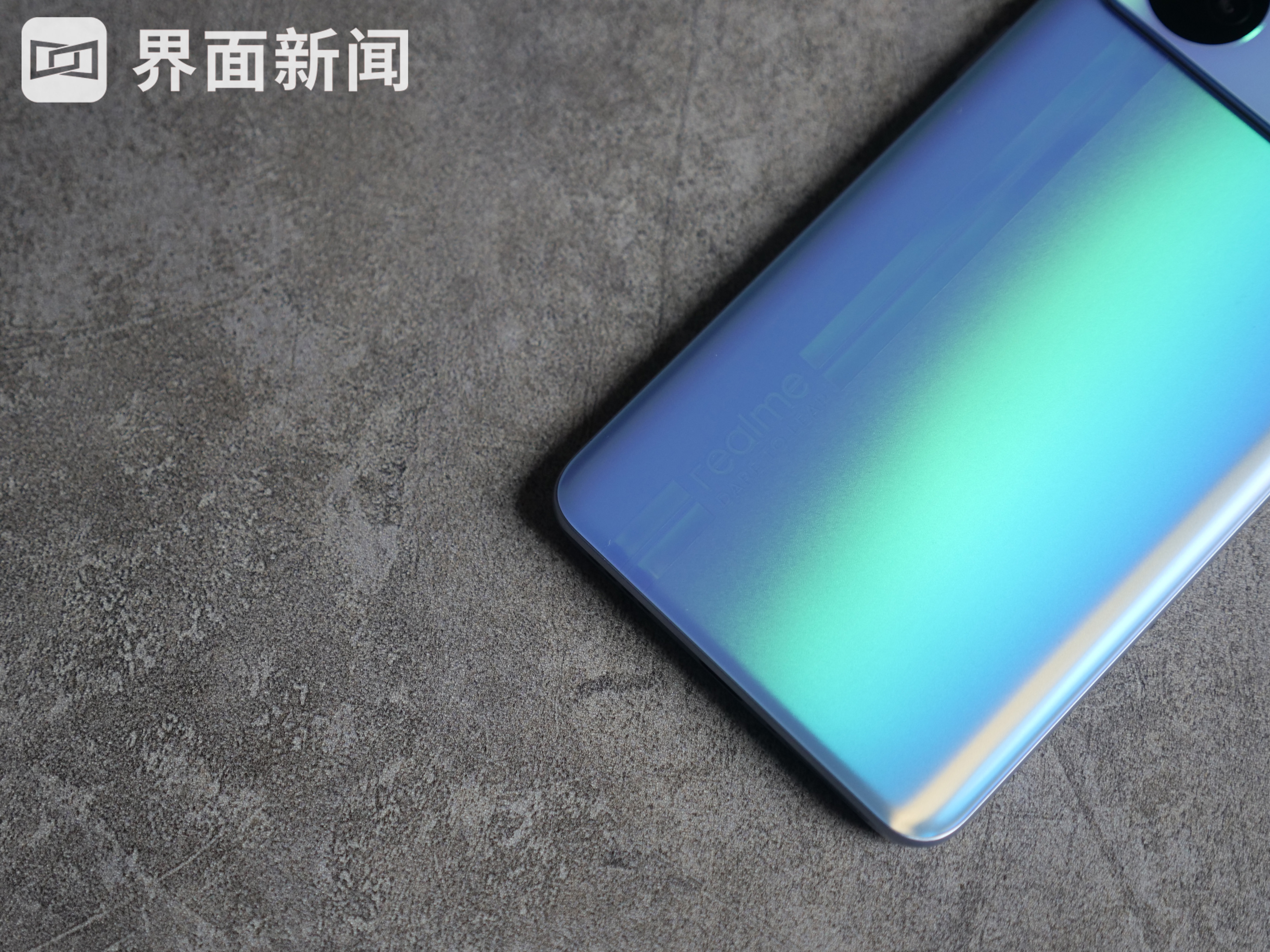 首先来看设计。真我GT Neo5 SE共有两款配色,分别为最终幻想以及极影黑。我手头的新机为前者,后盖采用了纳米级光哑熔合工艺,在不同光线的照射下会有类似渐变的效果,并且GT Neo5 SE的后盖依旧为realme标志性的双赛道设计。整机重约193.1g,坠手感并不是很强。