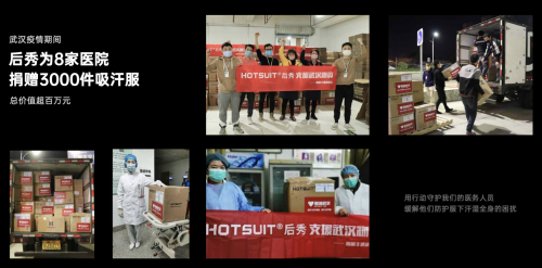2020年,HOTSUIT后秀驰援武汉,捐赠3000件总价值近百万元的吸汗服,缓解了医护人员长时间穿着闷热不透气的防护服而得了湿疹难忍的痛苦,把一份份暖意送到了抗疫一线医护人员手中。
