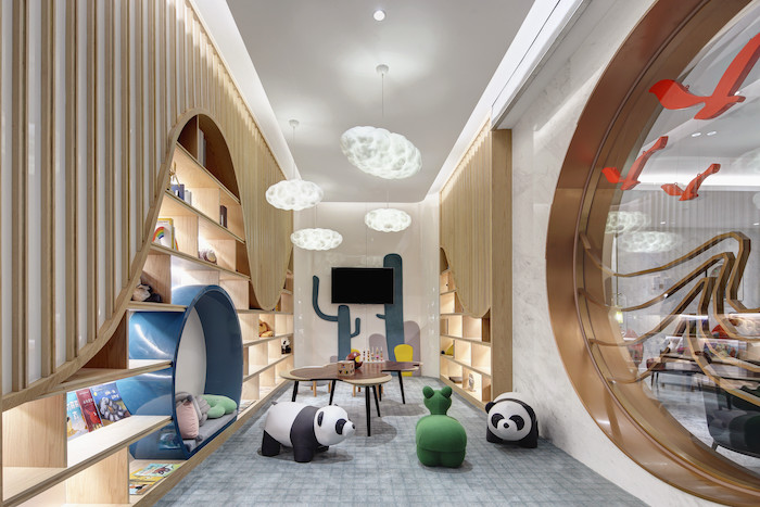 在人气旺盛的餐饮区,考虑到独自出游和二人同行的乘客越来越多,川航在天府两舱休息室增加了卡座和单人椅比例,还首次推出了儿童区的设置,小朋友可以使用软垫、小桌椅、图书等儿童玩具,还有专属的云朵灯饰。紧邻儿童区的是母婴室,婴儿整理台、洗手池、婴儿床和沙发等设施齐全,动线设计凸显巧思,是带娃出行人群解放双手的贴心角落。
