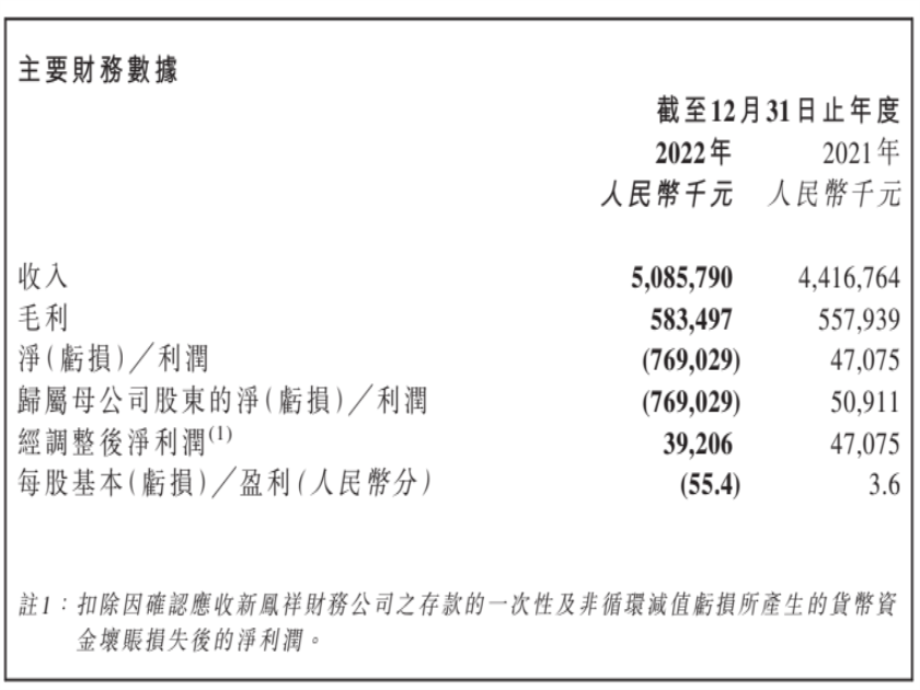 山东凤祥股份有限公司日前发布2022年业绩公告,报告期内,公司年度收入达50.86亿元,同比增长15.15%;毛利润5.83亿元,同比上涨4.58%;2022年净亏损7.69亿元,相比之下,2021年共盈利4708万元。控股股东发生变更的凤祥股份此前正着手实施从港交所退市计划。