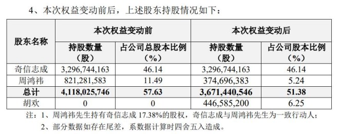 本次权益变动后,周鸿祎直接持有三六零37469.64万股,约占公司总股本5.24%(剔除回购专用账户中的股份数量后的比例为5.35%),通过奇信志成间接持有的三六零股份数量未发生变动;胡欢拟直接持有三六零44658.52万股,约占公司总股本6.25%(剔除回购专用账户中的股份数量后的比例为6.38%),成为公司持股5%以上股东。