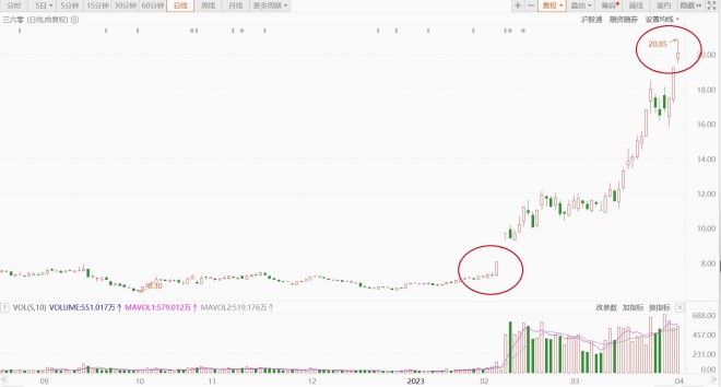 值得一提的是,2023年2月7日三六零股价收获一个“涨停板”,此后出现了一轮大幅上涨,并于4月4日触及阶段新高20.85元/股。从2月7日最低价7.19元/股到4月4日的最高价,区间涨幅达189.99%。