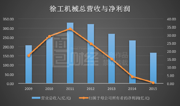 经历多年惨烈下跌之后,工程机械行业巨头的业绩终于看到回升的曙光。徐工机械发布的业绩预告显示,今年前三季度净利润为1.5亿—1.8亿元,增幅高达856.93%。中联重科虽在前三季出现亏损,但是第三季度,其盈利预计为2500万元—5000万元,而去年同期则为亏损2.08亿元。下图为面包财经根据徐工机械财报绘制的徐工机械总营收与净利润: