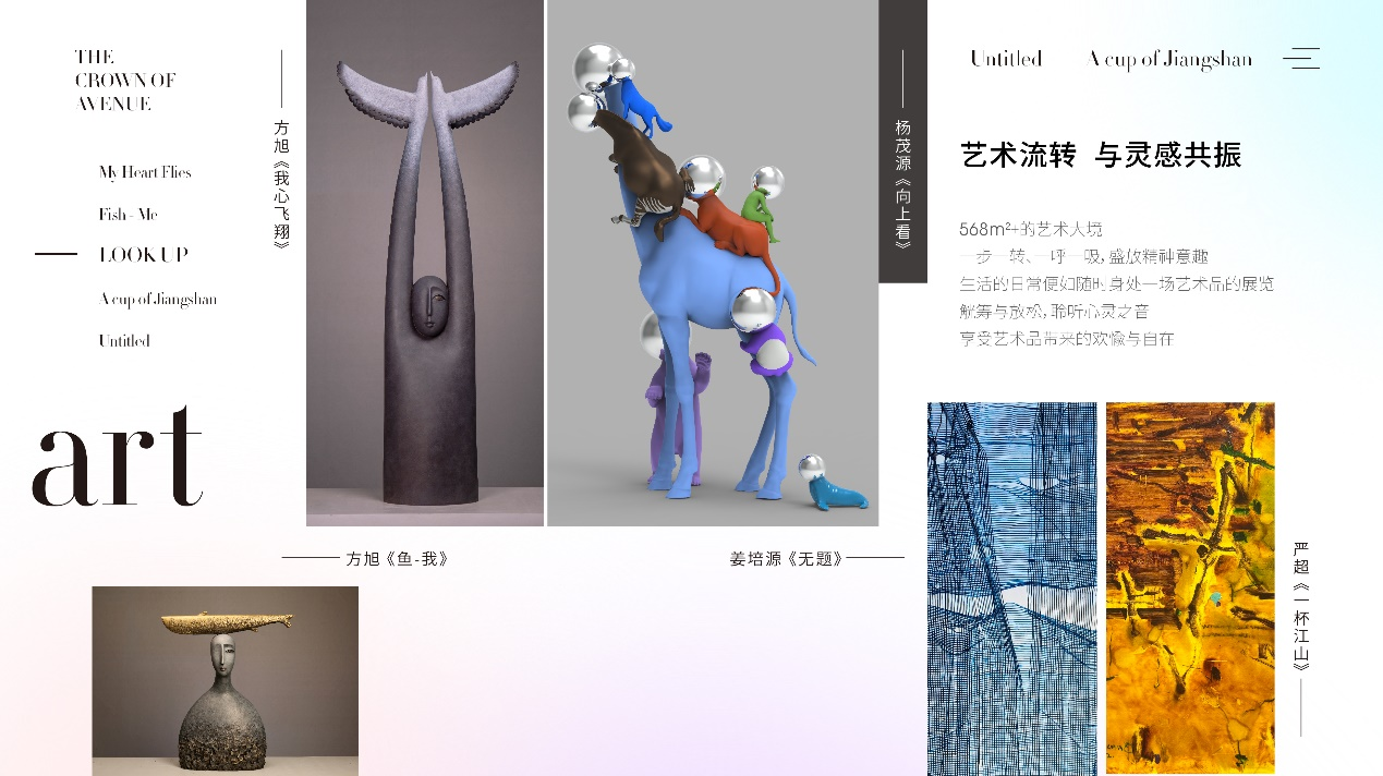 现代大众通过更多元化的途径,接触到了更丰富的艺术,他们的见识和修养有着丰厚的积淀。所以在樾长安的空间里,我们设置了当代艺术主题,比如方旭老师的《我心飞翔 NO.2》和《鱼-我》两件雕塑作品,严超老师的《一杯江山》。我们想通过艺术家的风格和品味,带给这个空间不一样的感受。