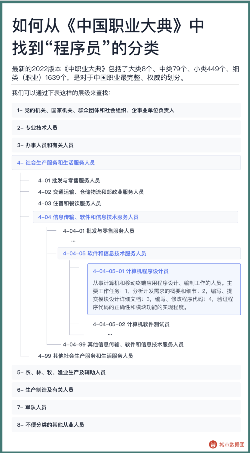 历次中国人口普查、人口动态抽样调查等,都使用《中国职业大典》作为每个被调查劳动者的职业划分依据。最新的2022版本《中职业大典》包括了大类8个、中类79个、小类449个、细类(职业)1639个,是对于中国职业最完整、权威的划分。