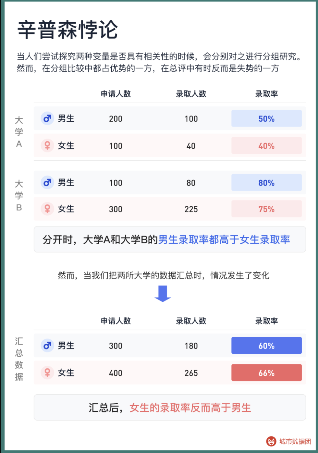 著名的辛普森悖论告诉我们一个结果:即便两组均值都在上升,其加总的均值却有可能下降。在下面的例子中,分开计算时大学A和大学B的男生录取率都高于女生,但在录取率较低的女性正在其录取率更高的那一组人数更多,导致汇总后,男生录取率却低于女生。