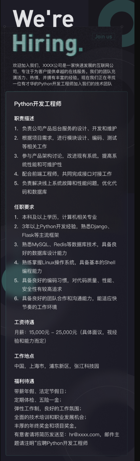 我们先用ChatGPT的GPT4模型生成下面这样一条典型的招聘广告: