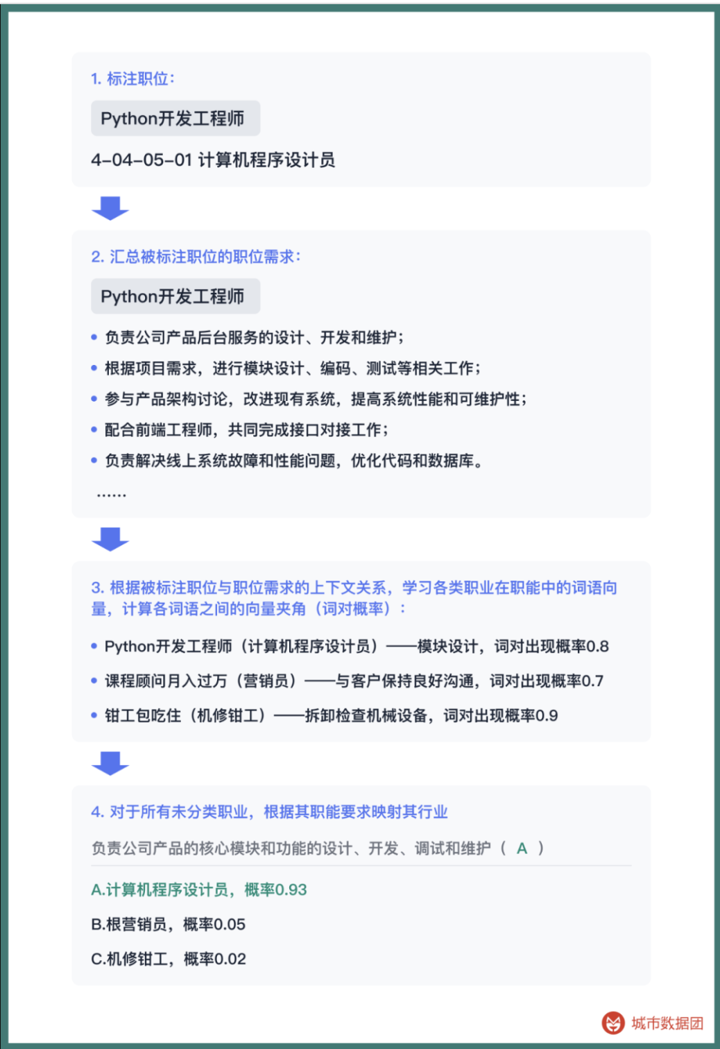 通过前期标注,将每一个职业的具体工作与该职业名称结合,计算职业-职能的高频率词对。再从招聘广告描述的工作职能出发,使用贝叶斯概率计算对应的可能是哪一种具体职业,像完形填空一样计算每一个职业的具体分类。
