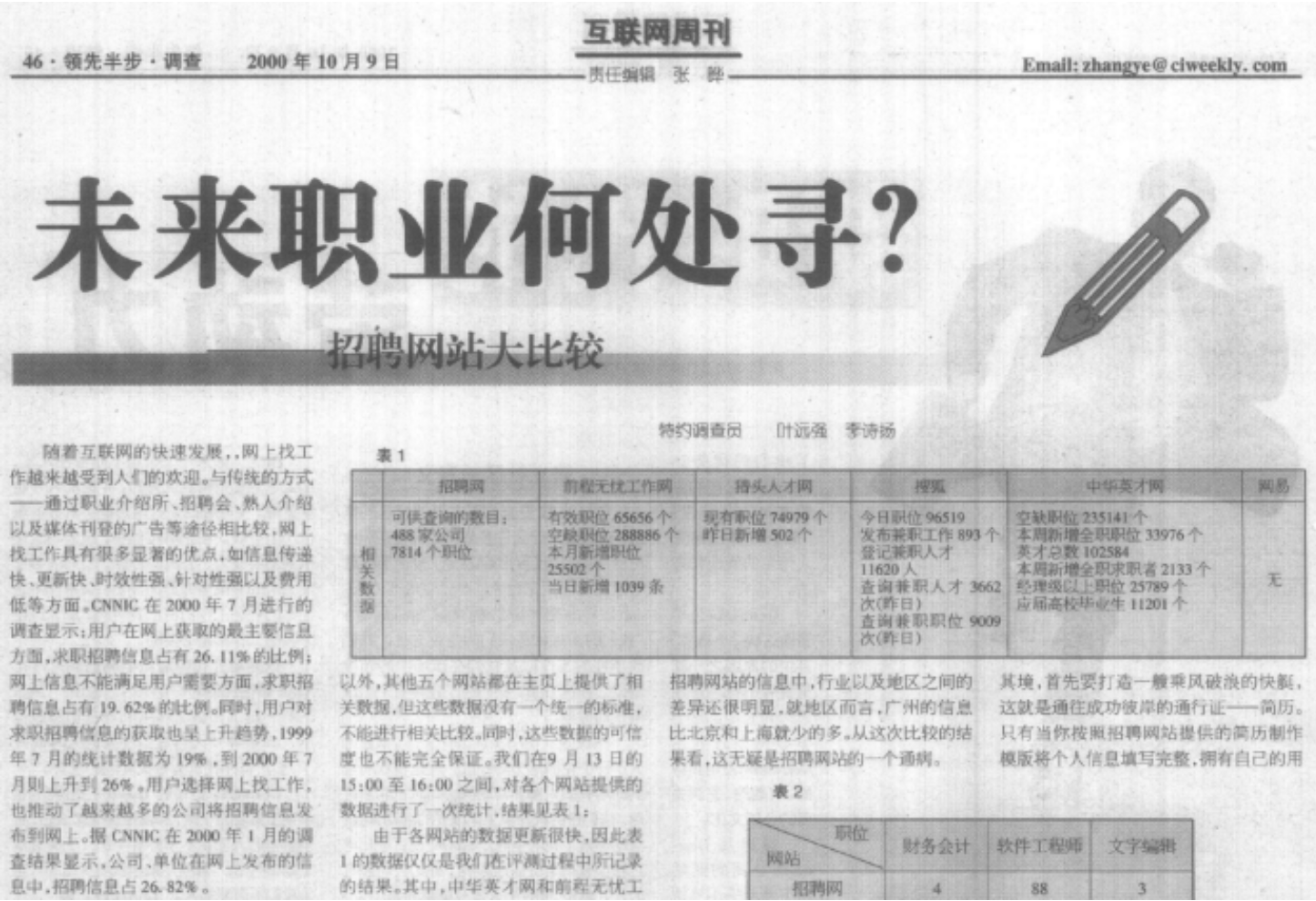 2000年10月9日,《互联网周刊》的一篇文章《未来职业何处寻?招聘网站大比较》一文引用了CNNIC在2000年7月的调查,人们上网获取的信息中,招聘求职信息占26.11%。