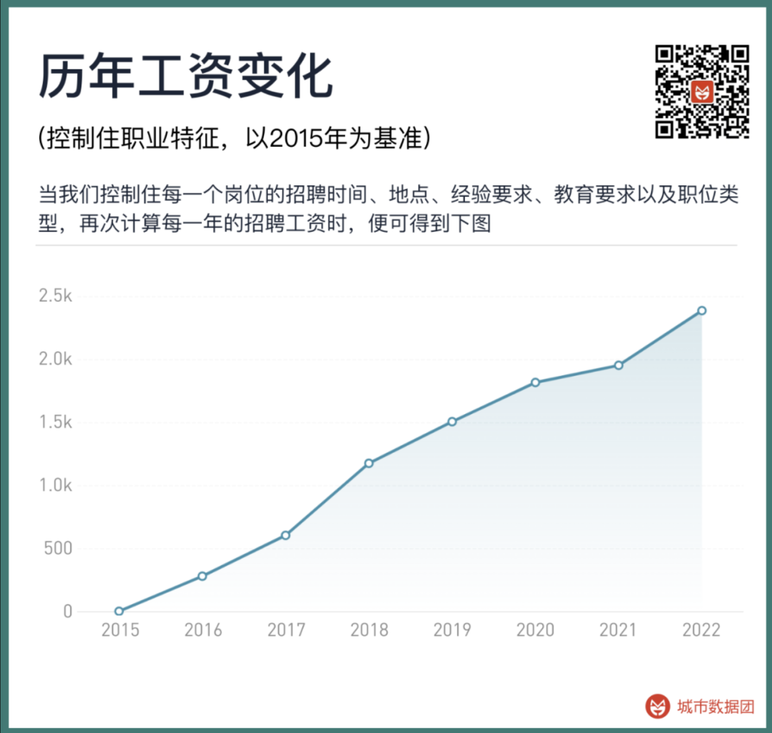此时,我们便能看到一条稳定向上的工资增长曲线,并未出现突然的下降。同样招聘时间、地点、经验要求、教育要求以及职位类型的一份工作,2022年的招聘工资比2015年要高出2385元。
