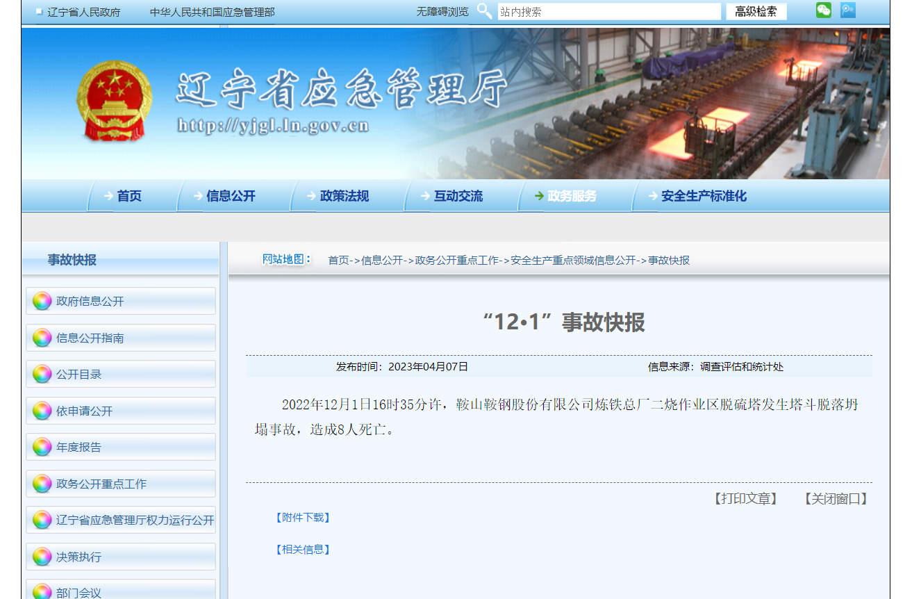 2022年12月1日16时35分许,鞍山鞍钢股份有限公司炼铁总厂二烧作业区脱硫塔发生塔斗脱落坍塌事故,造成8人死亡。