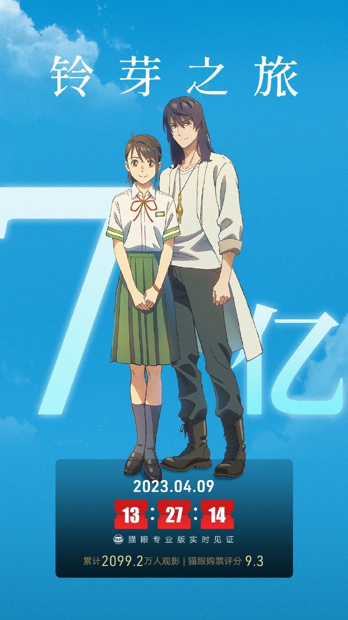 猫眼专业版数据显示,电影《铃芽之旅》上映17天 ,总票房破7亿。