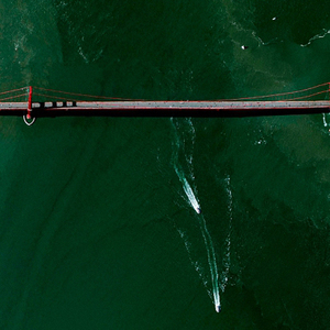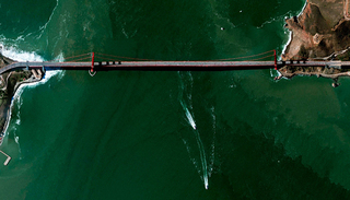 8. 37·818672°, –122·478708° 金门大桥坐落于美国加利福尼亚州的圣地亚哥,长约27公里,横跨金门海峡连接圣地亚哥港和太平洋。设计者为了让大桥与周围环境颜色互补并提高她在雾中的辨识度将之漆上橙色,又被称为“国际橙”。