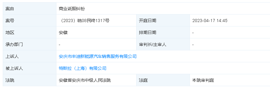 天眼查App显示,近日,特斯拉(上海)有限公司新增一则二审开庭公告,案由为商业诋毁纠纷,上诉人为安庆市丰迪新能源汽车销售服务有限公司(比亚迪汽车海洋网安庆丰迪4S店),案件将于4月17日在安徽省安庆市中级人民法院开庭审理。据媒体此前报道,安庆丰迪4S店因发布配文为“保时捷车主来看比亚迪 比亚迪已势不可当 就像一辆没有刹车的特斯拉”的短视频,被特斯拉起诉。法院审理认为,被告通过编造、传播误导性的信息,给特斯拉汽车现有及潜在消费者以特斯拉汽车没有刹车或者刹车有问题的误导性的信息,构成商业诋毁,判决安庆丰迪4S店刊登声明致歉,并赔偿特斯拉经济损失5万元。