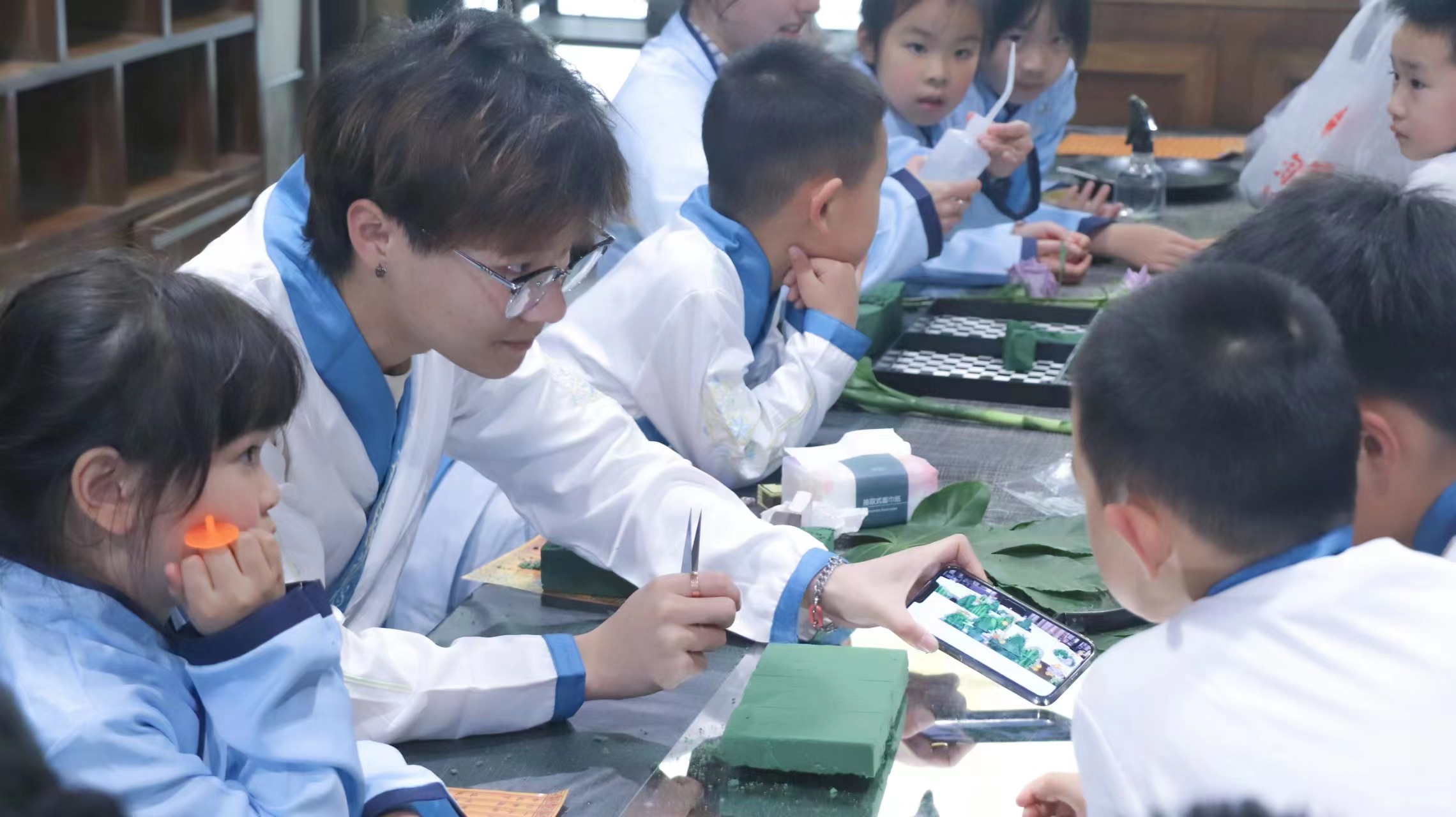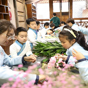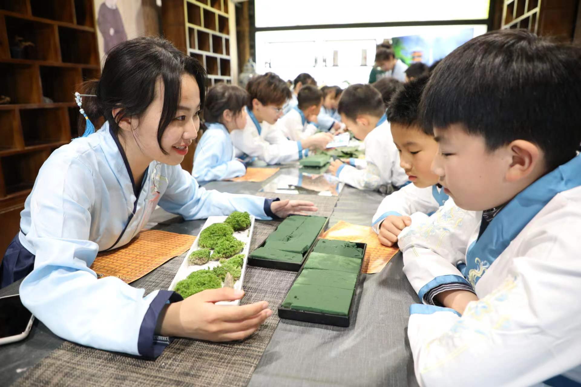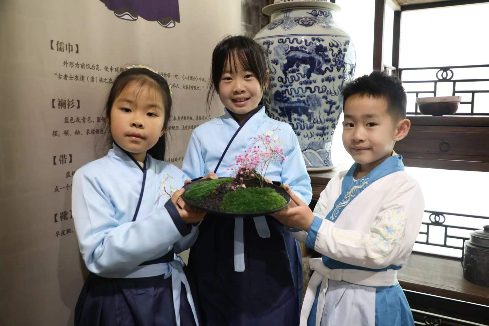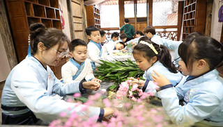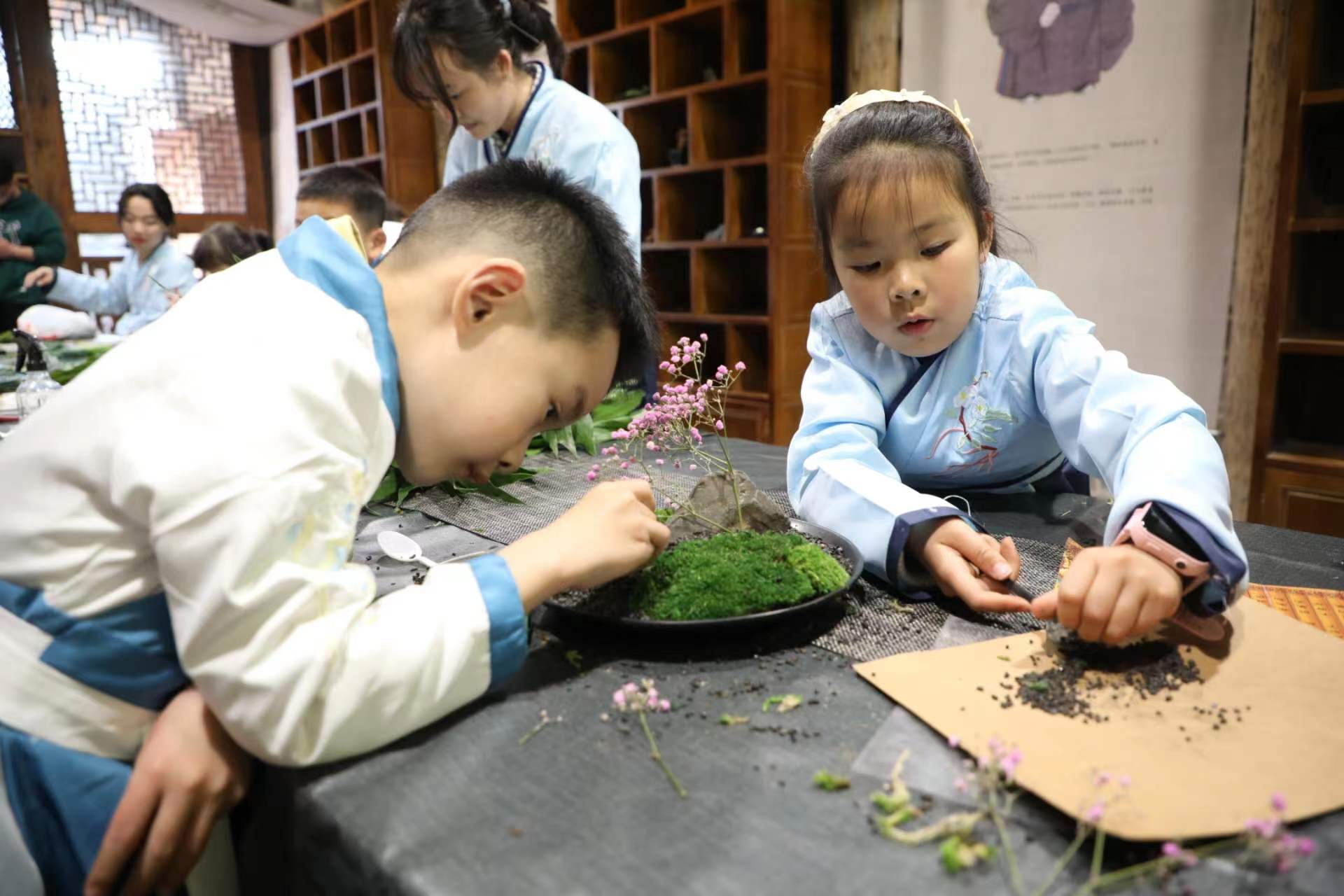 “小朋友,你们知道我们今天上课的这个‘御史第’是一个什么样的地方吗?御史是古代监察朝廷官吏失职和不法行为的官员。你们在大门口看到的是“廉政壁”,壁上题写‘廉’和‘法’两个大字,中间是一幅‘獬豸望月’图。獬豸是古代独角神兽,是我国传统文化中执法公正的化身……”昨日,在“中国御史之乡”宁波市古林镇茂新村的御史第,宁波财经学院的刘振博士正在线上给一群小学生讲廉洁家风故事,现场的桌子上摆放着一些花草和景观石,该校艺术设计学院教授《景观设计》的张宁老师带着几个大学生坐在一群身着汉服的小学生中,他们一会要教孩子们动手做一组诗词意境中的微景观。
