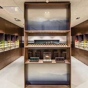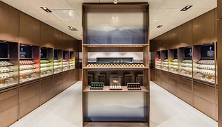 店内使用香槟色不锈钢展柜,独特的处理技术使金属展柜不会被留下指纹。天花板和地砖都是手工切割定制,柜体的缝隙被严格控制在小于0.5毫米。