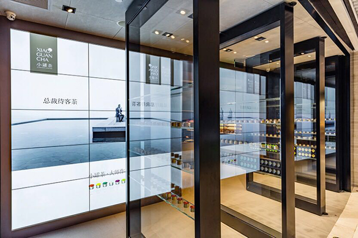 走进这家“茶体验店”,最先映入眼帘的是身兼展示柜的全不锈钢落地玻璃转门,代表不同品类的不同颜色小罐茶有序地在此陈列,给人留下现代、规整的第一印象。