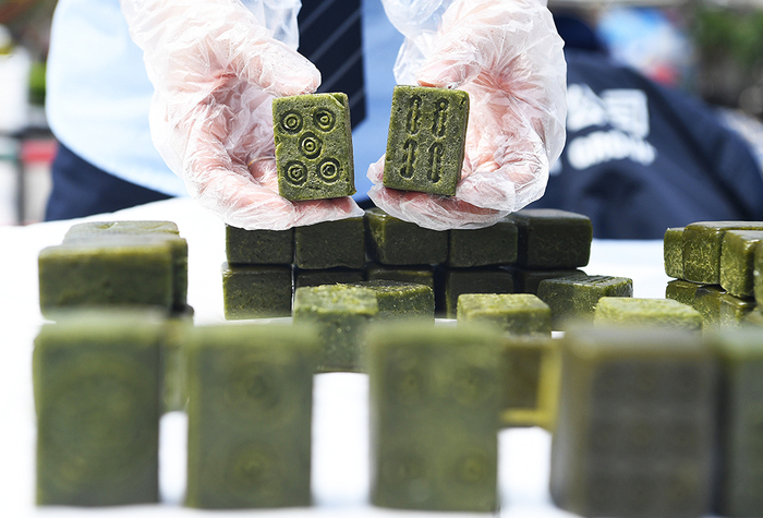 2022年4月2日,清明节将至,重庆涪陵红酒小镇景区工作人员制作了“麻将”青团,邀请游客前来免费品尝,一起感受清明传统文化。工作人员展示麻将造型的青团。