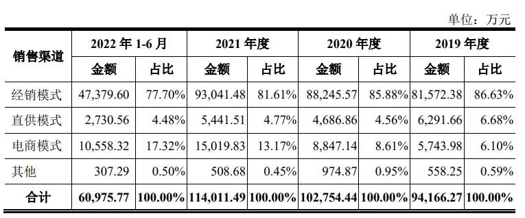 销售渠道来看,登康口腔主要销售模式为经销、直供和电销模式,其中经销模式占据主要地位。招股书显示,2019年至2022年1-6月各期,公司经销模式收入分别为8.15亿元、8.82亿元、9.30亿元和4.73 亿元,占当年主营业务收入的比例分别为86.63%、 85.88%、81.61%和77.70%。