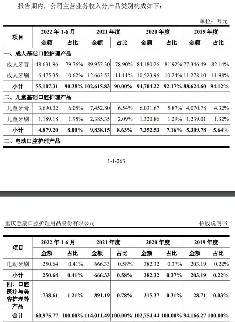 从品牌建设来看,公司的营收主要集中在成人基础口腔护理产品。招股书显示,2019年至2022年前六个月,公司成人基础口腔护理产品分别实现营收8.86亿元、9.47亿元、10.26亿元和5.52亿元,在主营业务收入的占比分别为94.12%、92.17%、90.00%和90.38%。而成人基础口腔护理产品中,又以知名品牌“冷酸灵”的贡献最大。